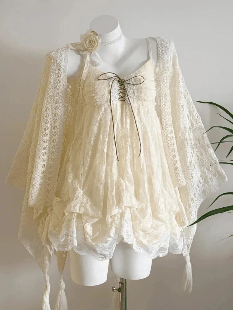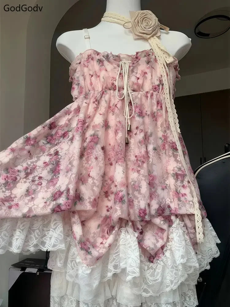 New Vintage Summer Women Sets Elegant Ruffle Lace Chiffon Design Mini Skirt Suit Fairy Female Sweet Korean Fashion Outfits 2025