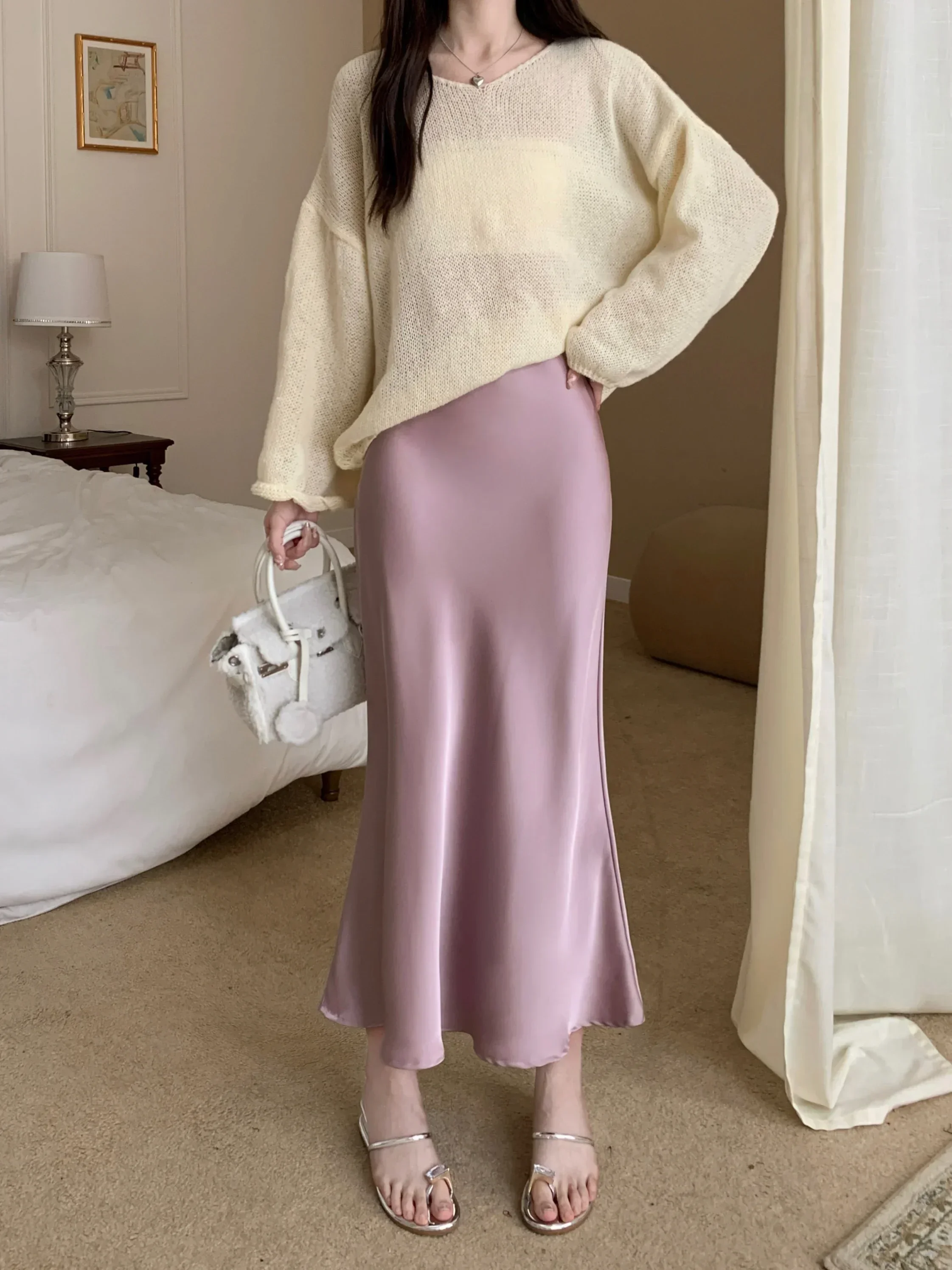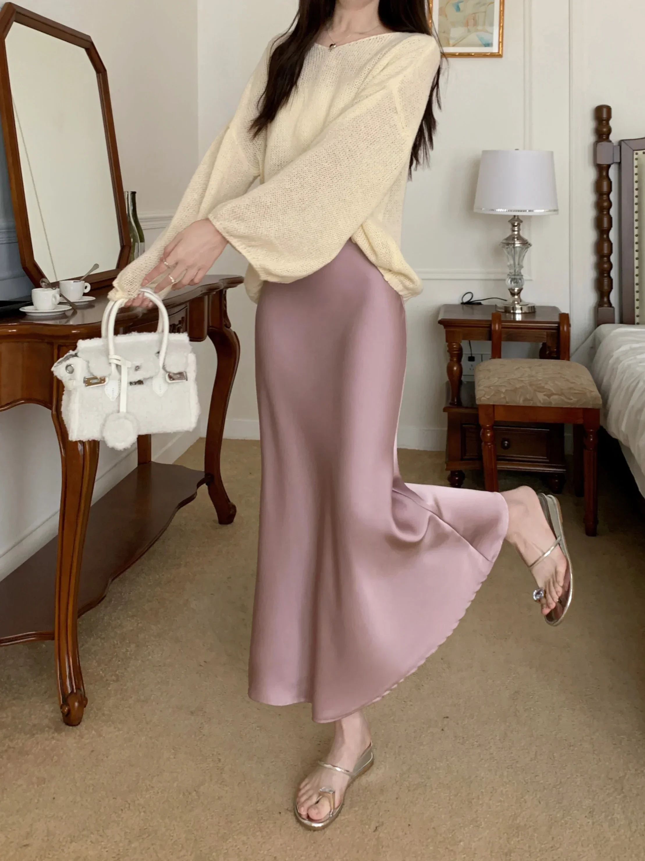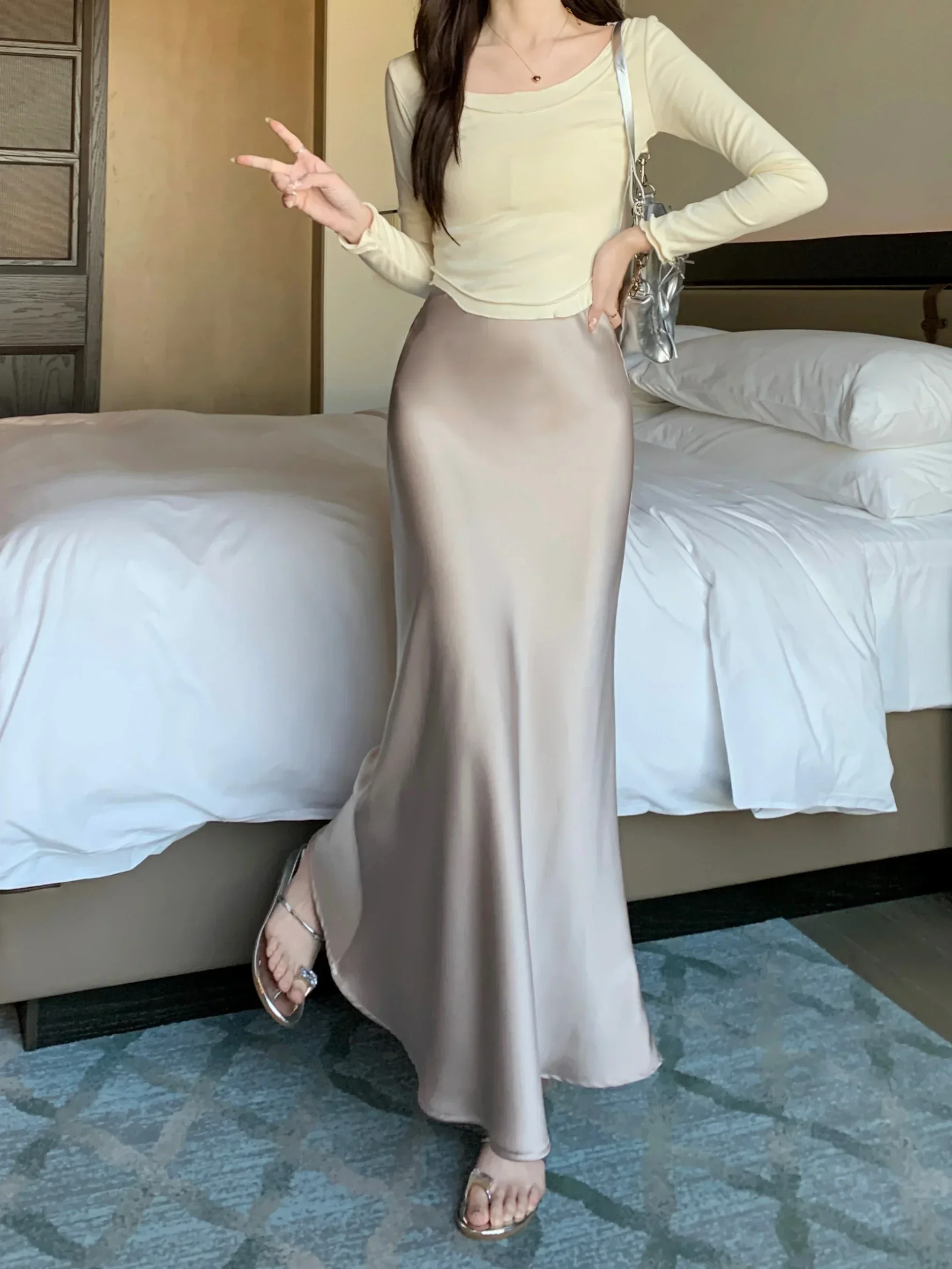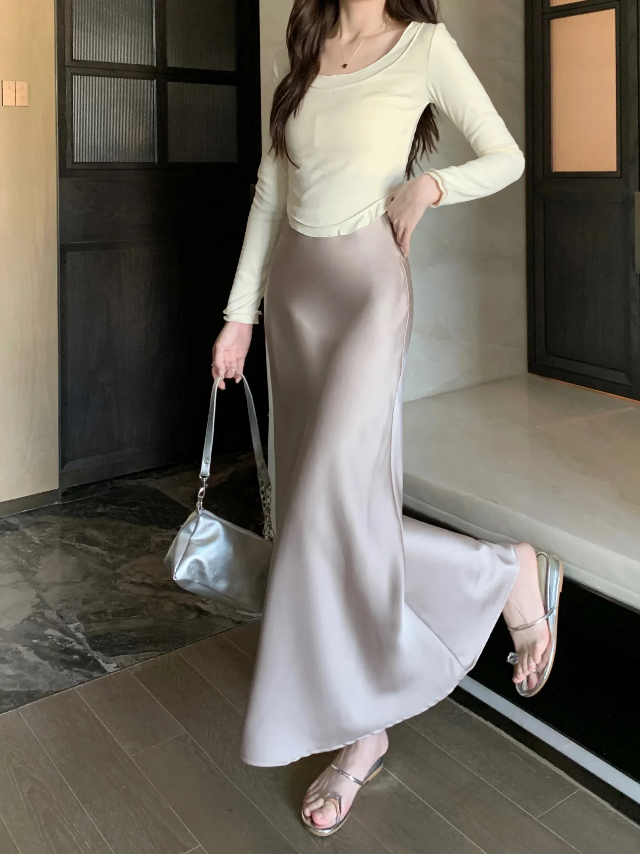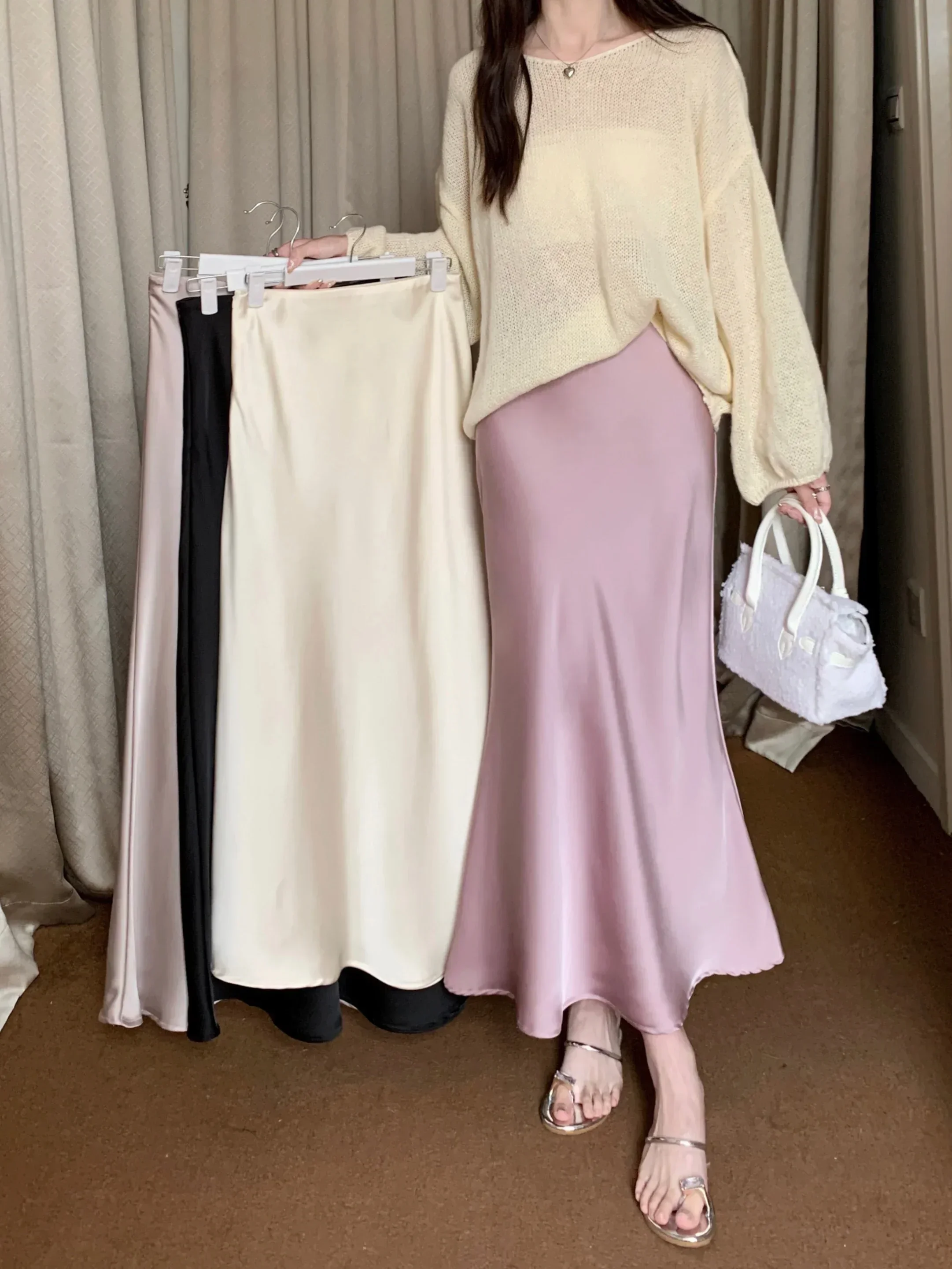 Spring Summer Women's Long Skirt High Waist Satin Silk A-line Skirt Ladies Korean Fashion Solid Pink Fishtail Skirts for Women