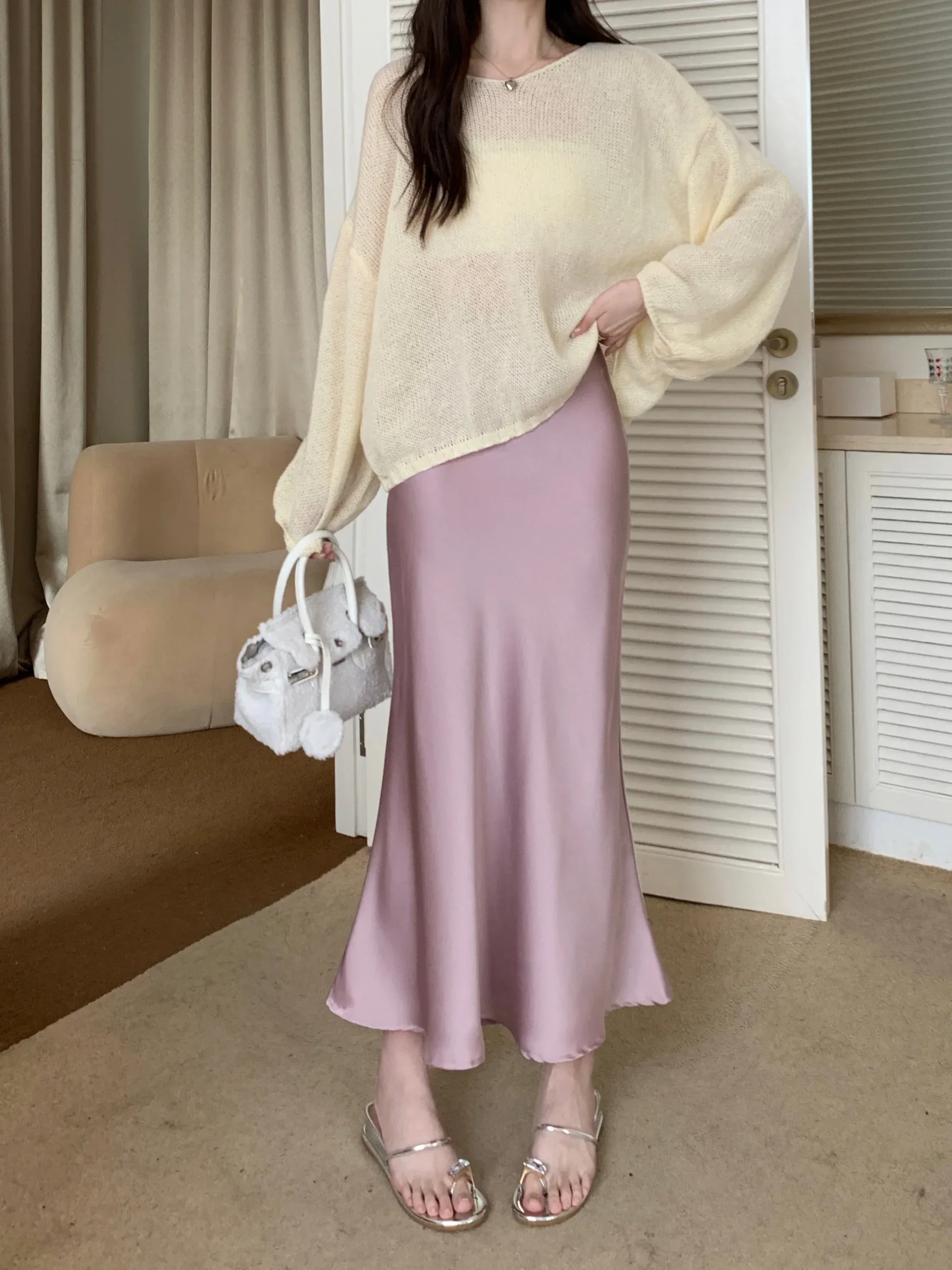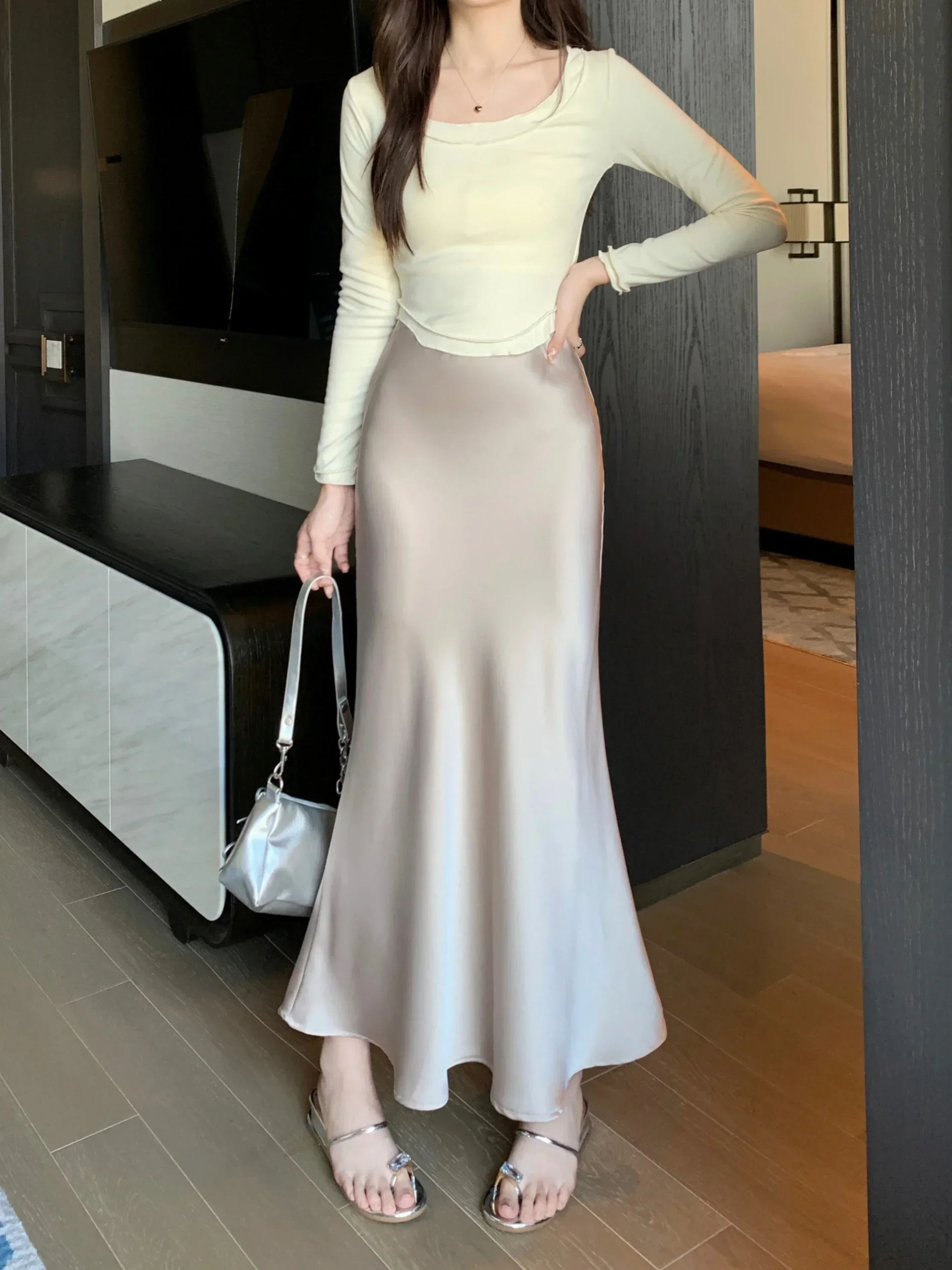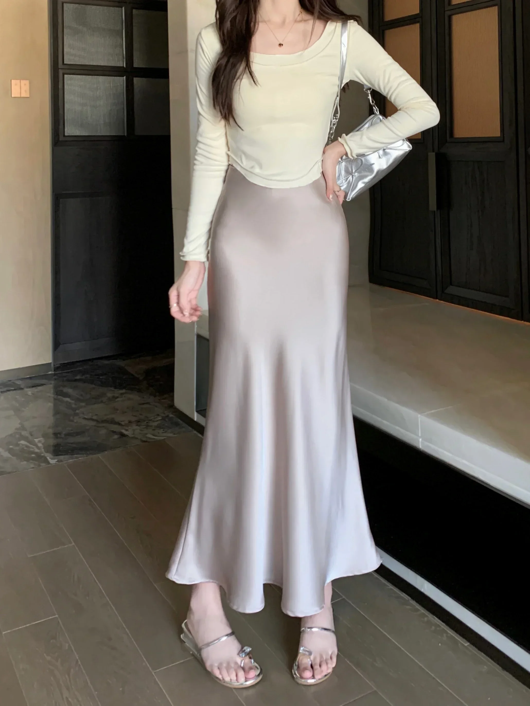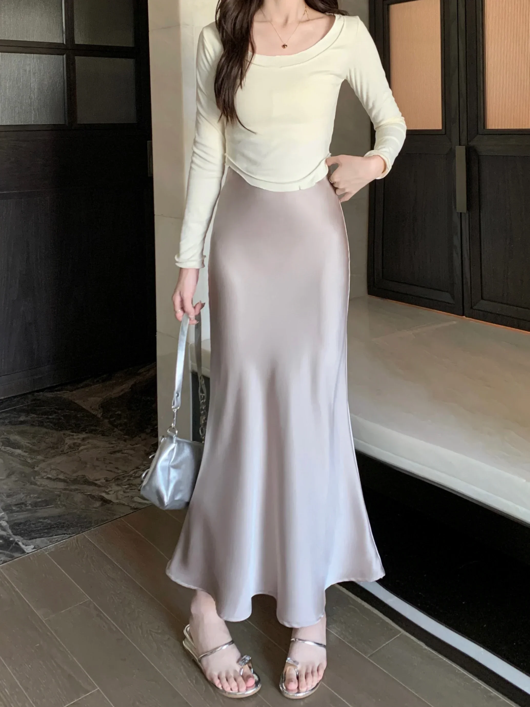 Spring Summer Women's Long Skirt High Waist Satin Silk A-line Skirt Ladies Korean Fashion Solid Pink Fishtail Skirts for Women