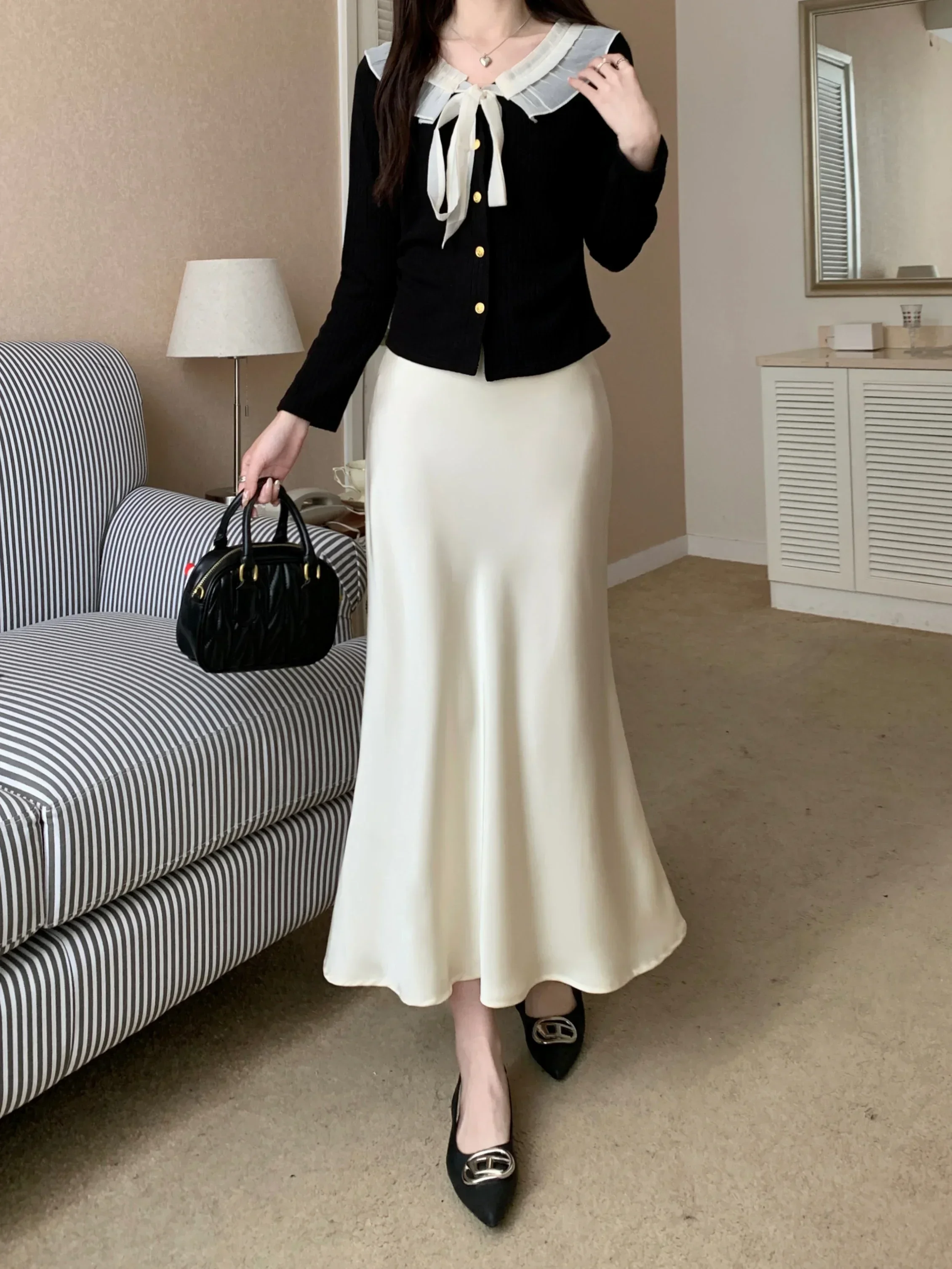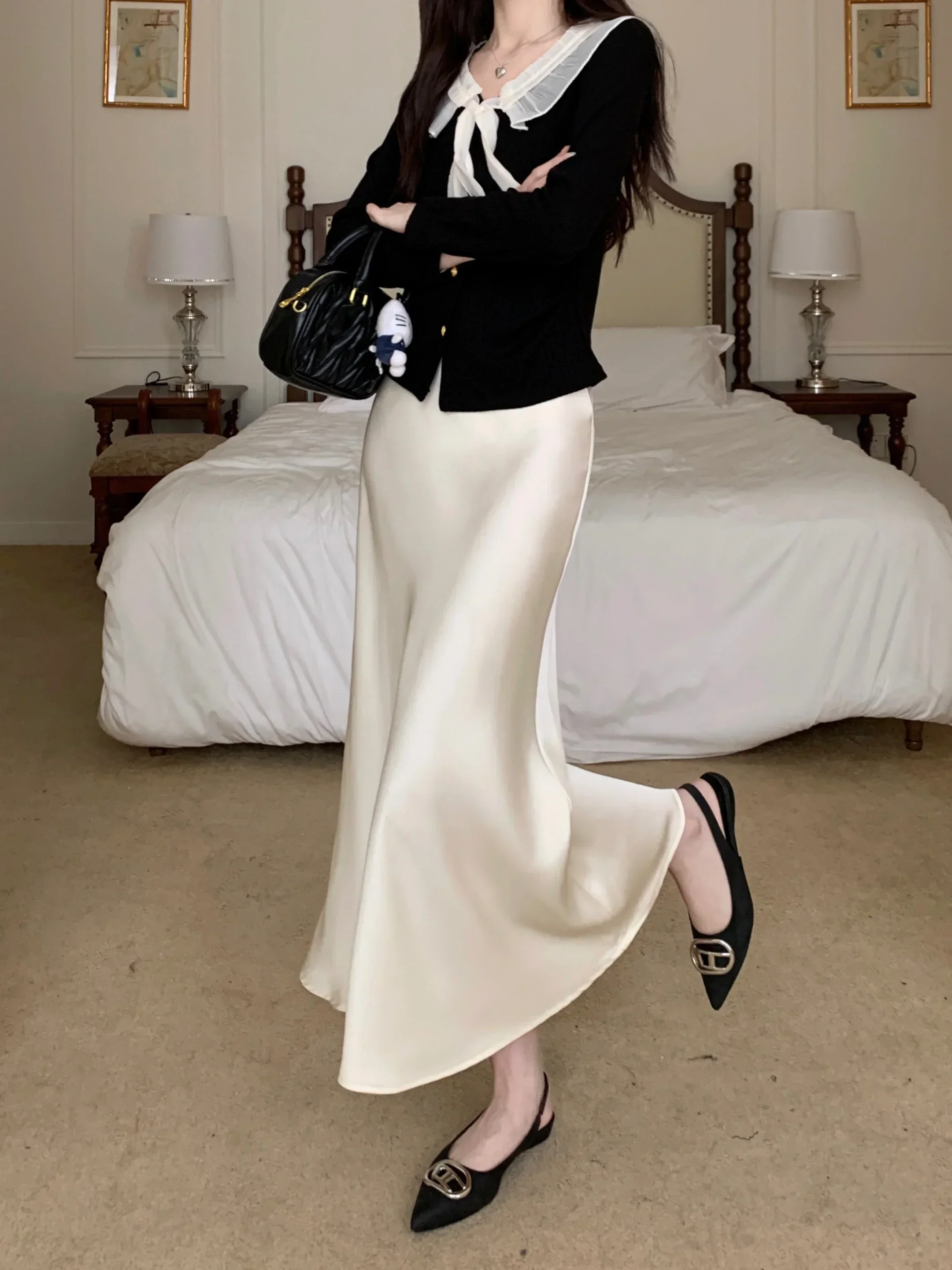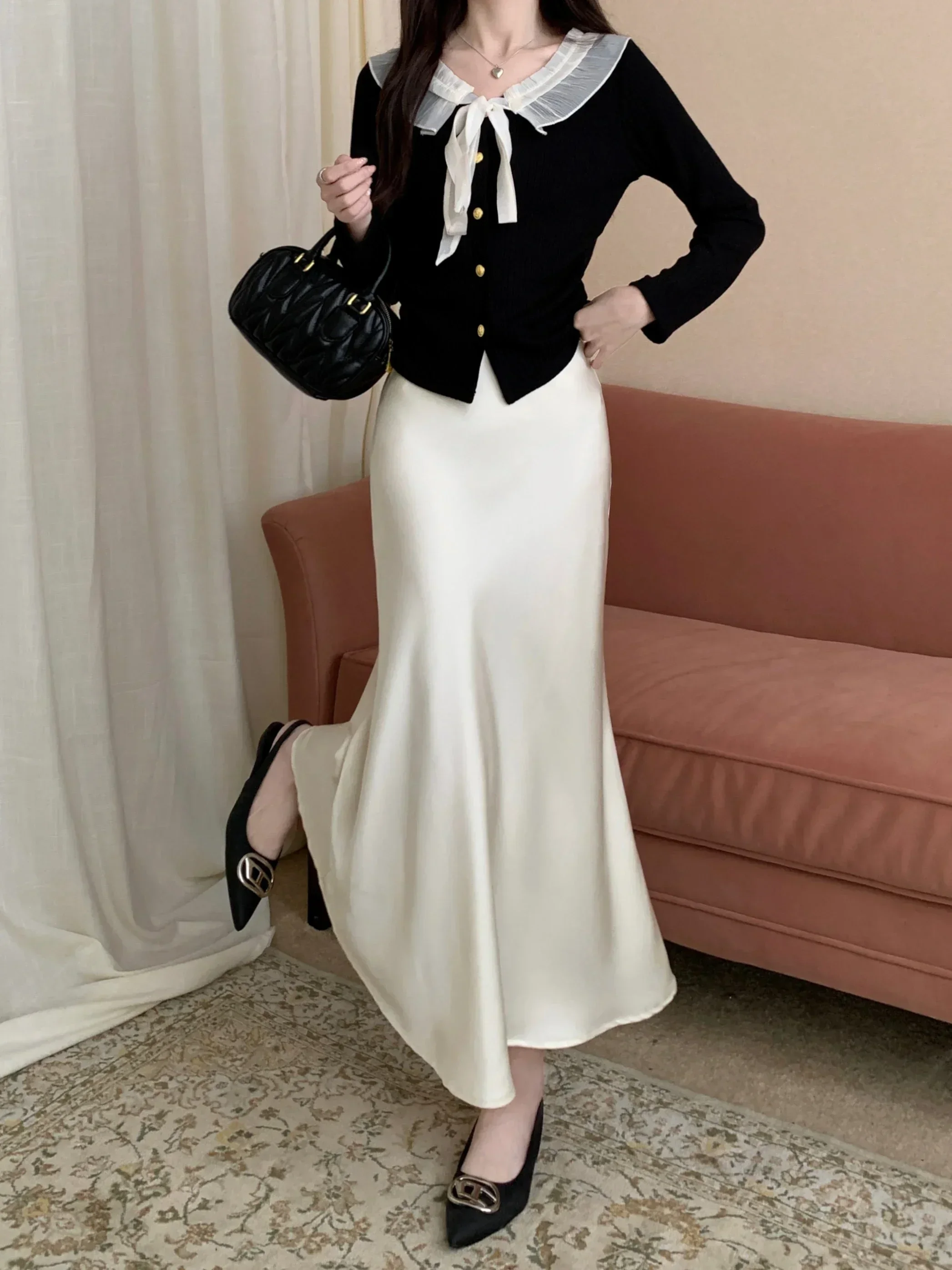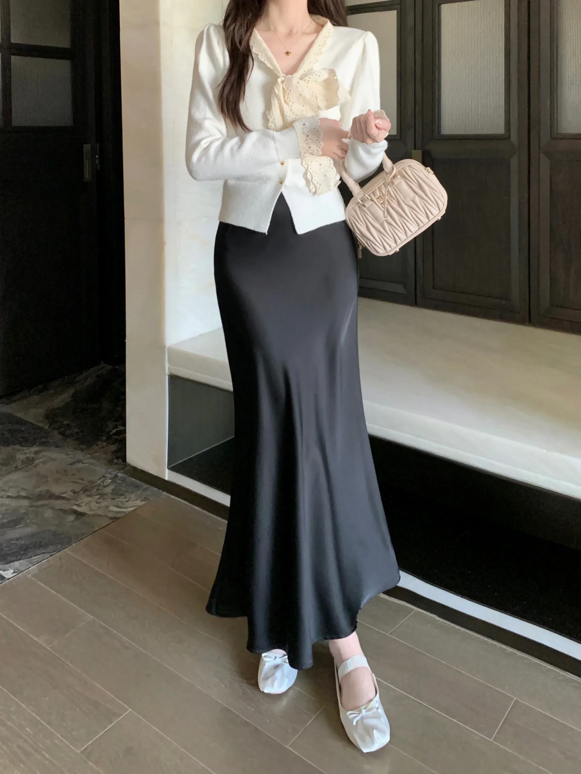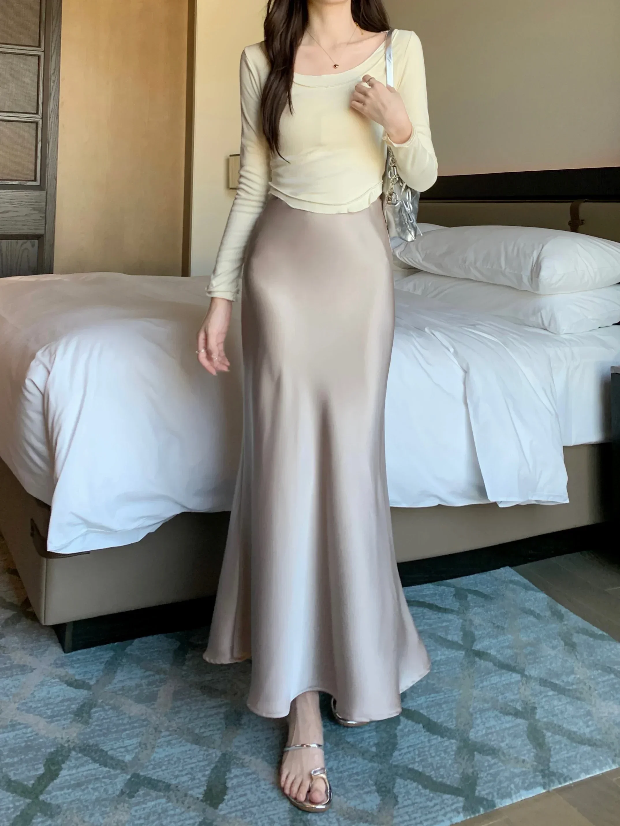 Spring Summer Women's Long Skirt High Waist Satin Silk A-line Skirt Ladies Korean Fashion Solid Pink Fishtail Skirts for Women