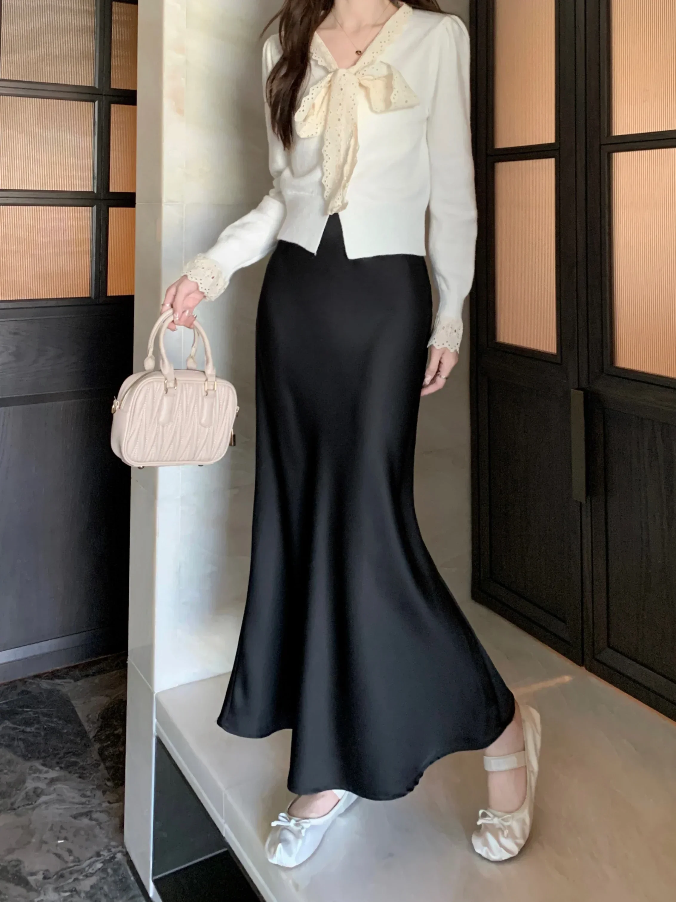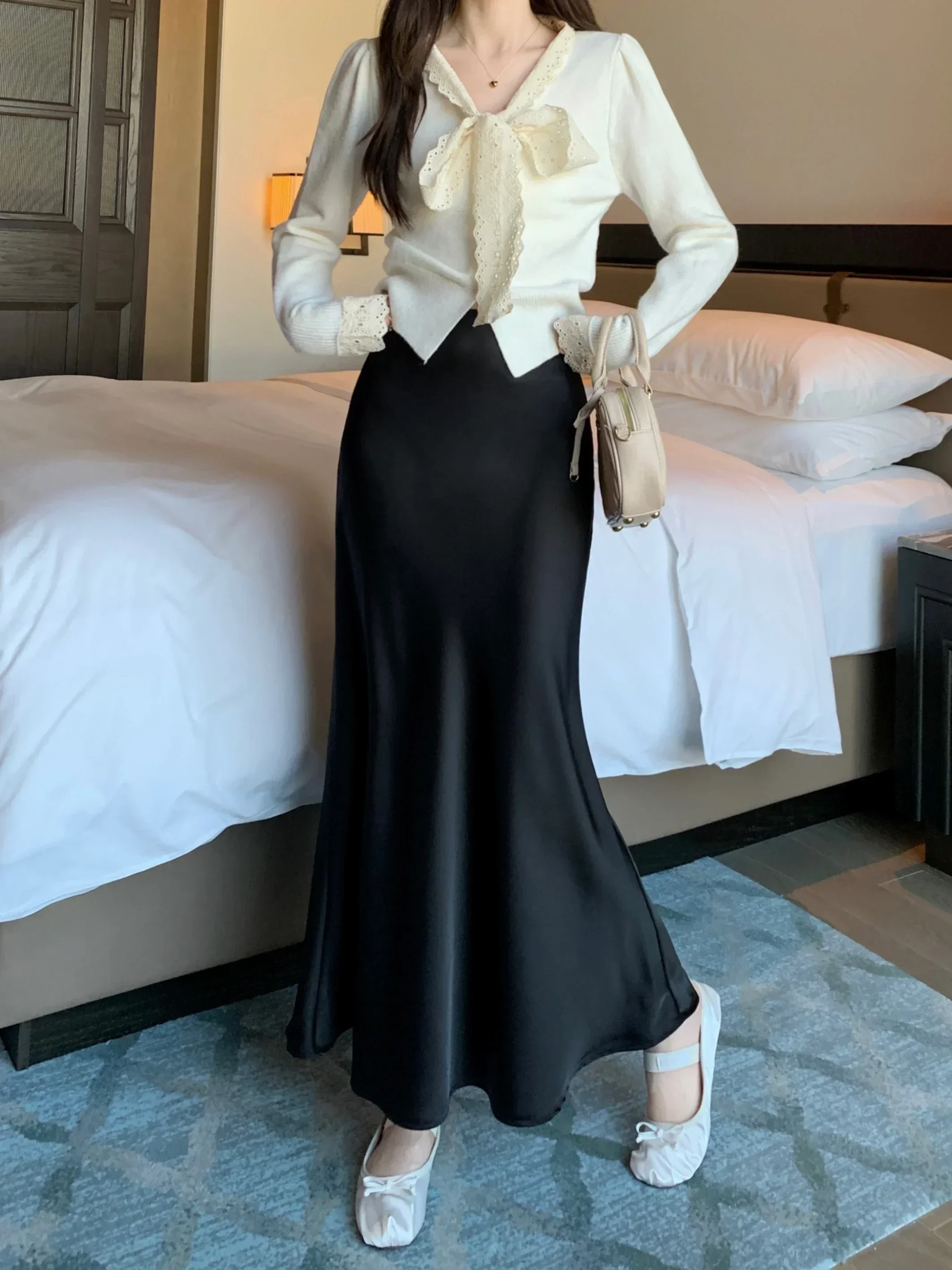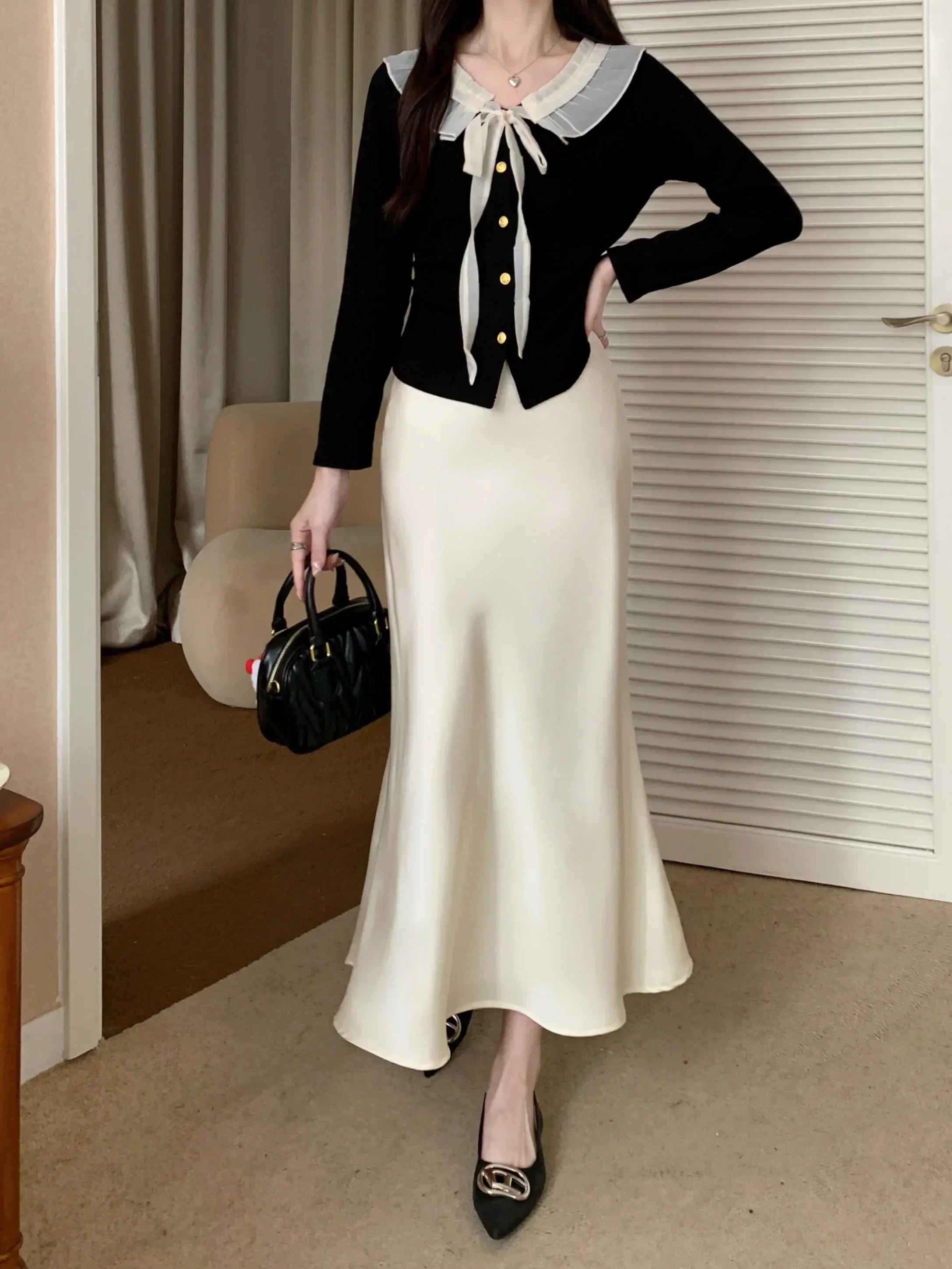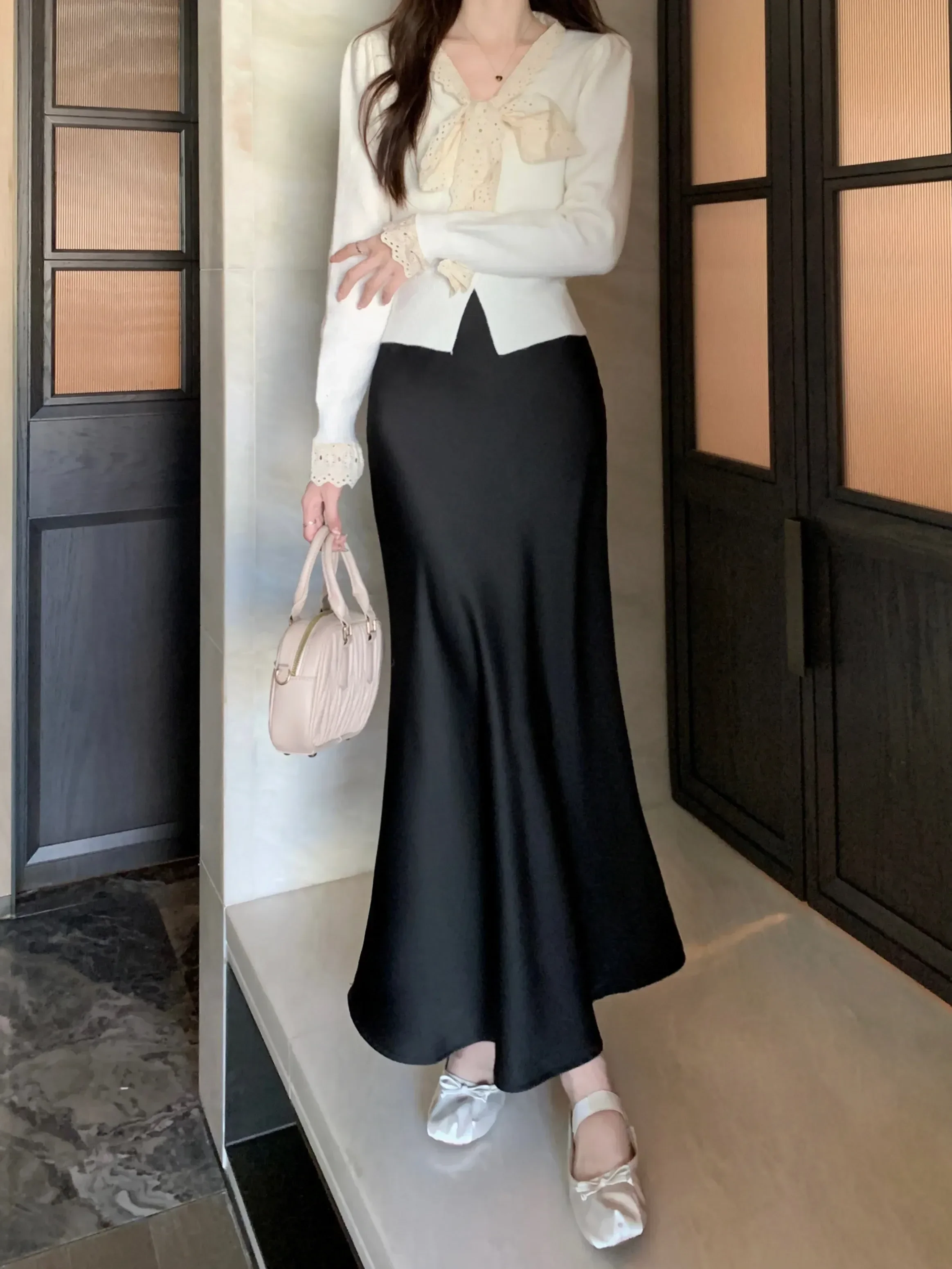 Spring Summer Women's Long Skirt High Waist Satin Silk A-line Skirt Ladies Korean Fashion Solid Pink Fishtail Skirts for Women