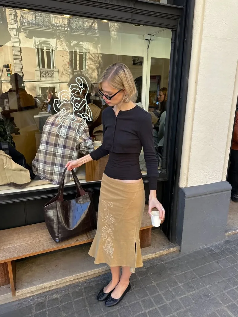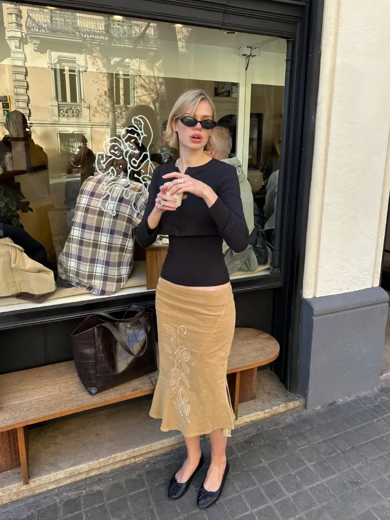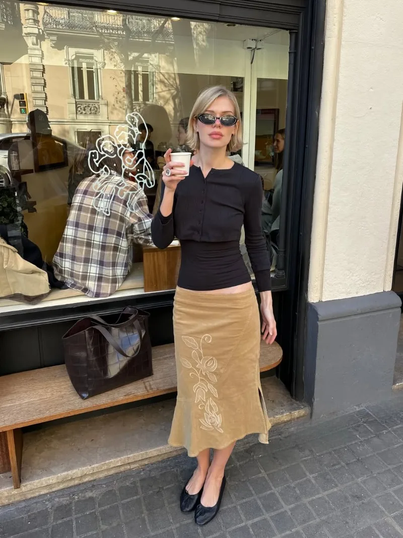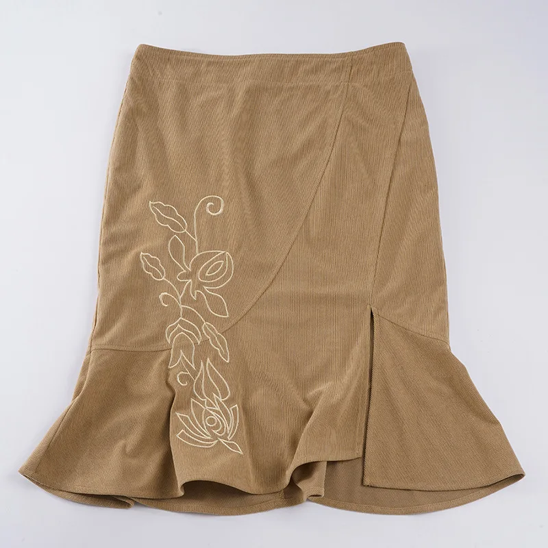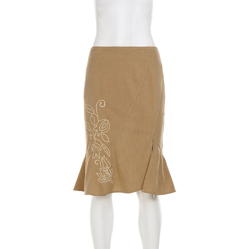 Trendix Women's Vintage Midi Skirt 2026 Summer High Waist Slim Ruffle Fishtail Skirts Party Side Slit Elegant Embroidery Skirt