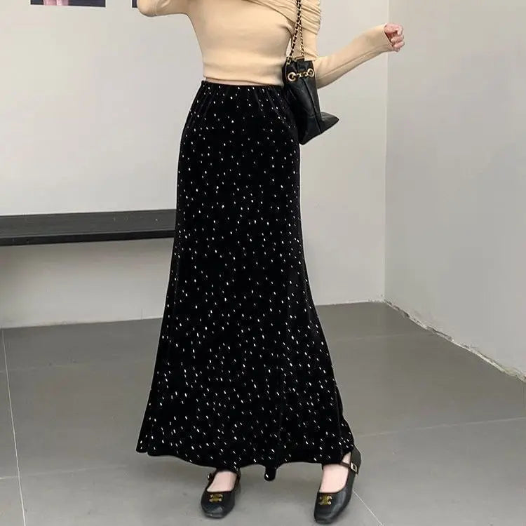 Golden velvet skirt autumn and winter 2025 new high-waisted A-shaped thin hip heavy industry hot diamond fishtail skirt