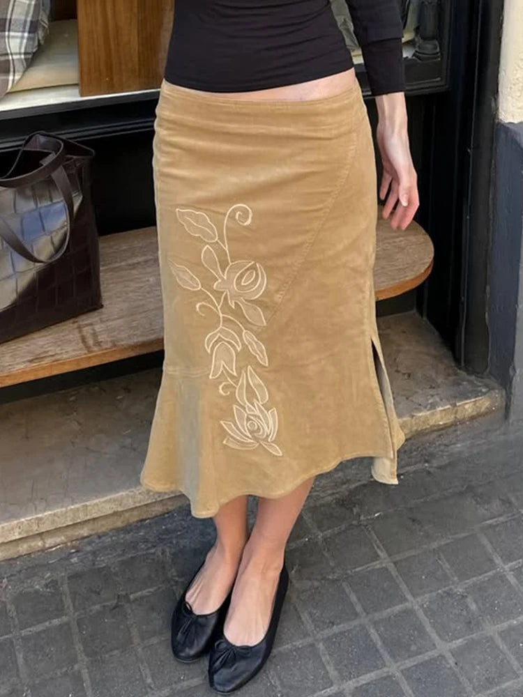 Trendix Women's Vintage Midi Skirt 2026 Summer High Waist Slim Ruffle Fishtail Skirts Party Side Slit Elegant Embroidery Skirt