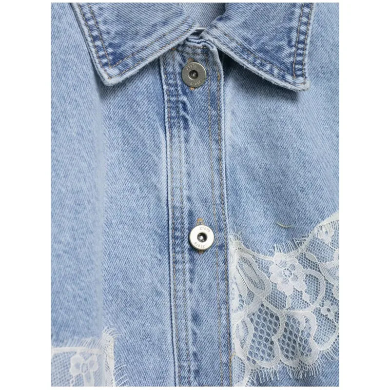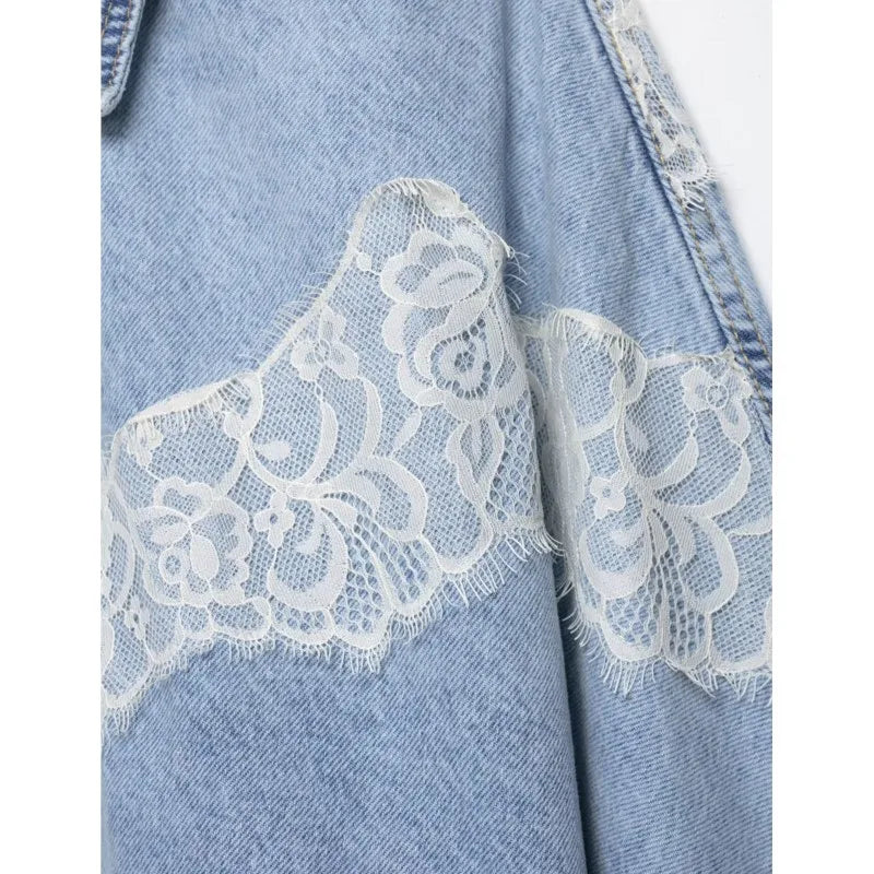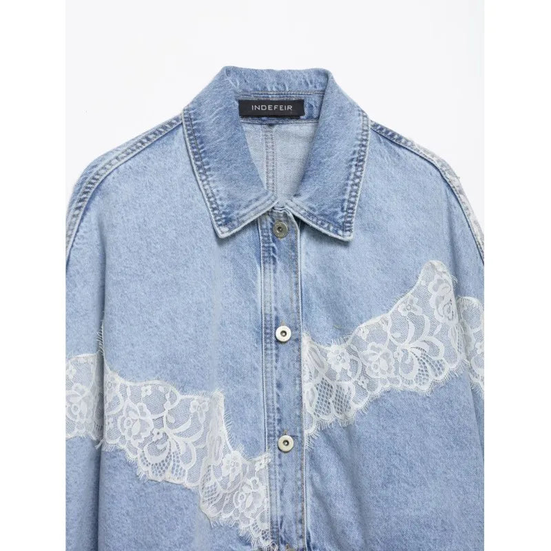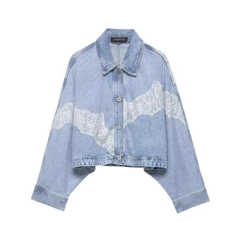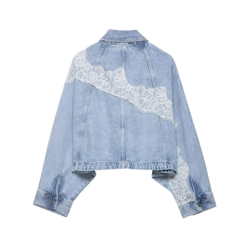 Women's Cropped Lace Denim Jacket New 2026 Spring Long Sleeve Button Female Chic Outerwears High Street Lady Chic Tops