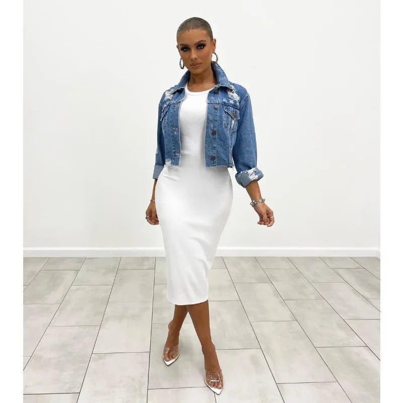 Women's Short Denim Jacket Distressed Frayed Hem Long Sleeve Collared Streetwear Fashion